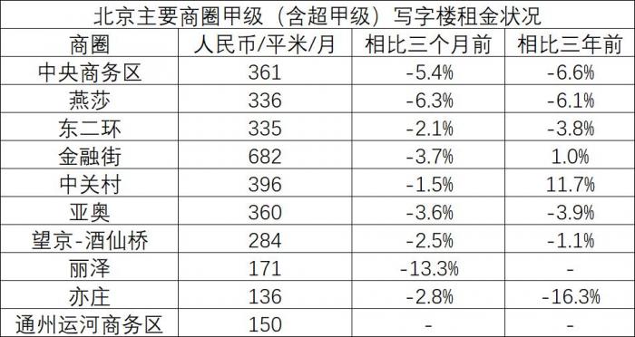 从商圈来看,戴德梁行的数据显示,北京几大核心商圈,包括此前一直坚挺的金融街板块,租金相比一季度全部环比下降。