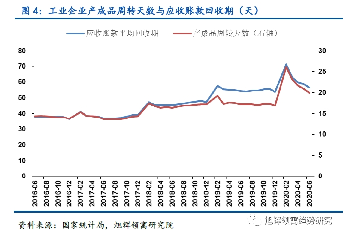 6月末,规模以上工业企业应收账款15.34万亿元,同比增长12.7%,较5月末回落0.3个百分点;产成品存货4.44万亿元,增长8.3%,较5月末减少0.7个百分点。产成品存货周转天数为20.0天,环比减少0.9天;应收账款平均回收期为56.6天,环比减少2.2天。产成品库存持续下降的同时,应收账款有所改善,产成品周转天数与应收账款回收期高位回落,表明需求逐步回暖,通过企业信用政策刺激销售回升的必要性下降。