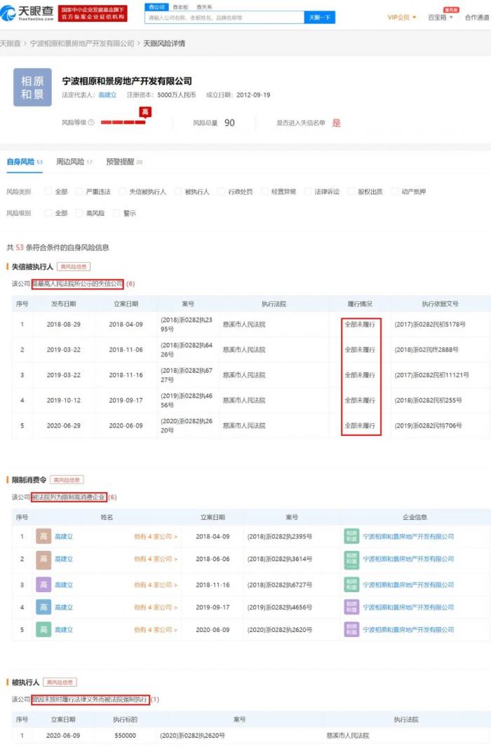 据钱江晚报报道,这家开发商名为宁波相原和景房地产开发有限公司,天眼查信息显示,该开发商为被公示的失信公司,且有多条高风险信息。