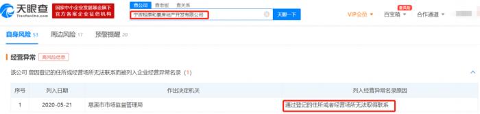 今年5月,宁波相原和景房地产开发有限公司还曾因通过登记的住所或者经营场所无法取得联系而被列入企业经营异常名录。