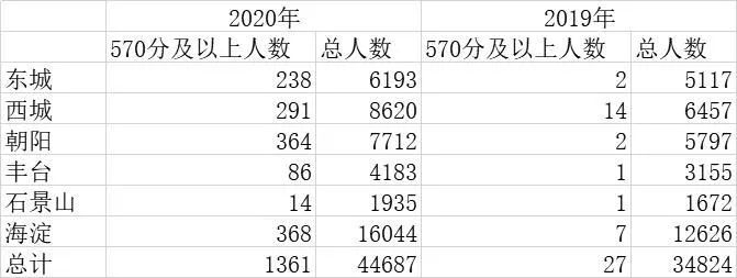 北京中考570分及以上的考生有1455人,其中城六区有1361人。而在2019年,城六区570分及以上的考生只有27人。