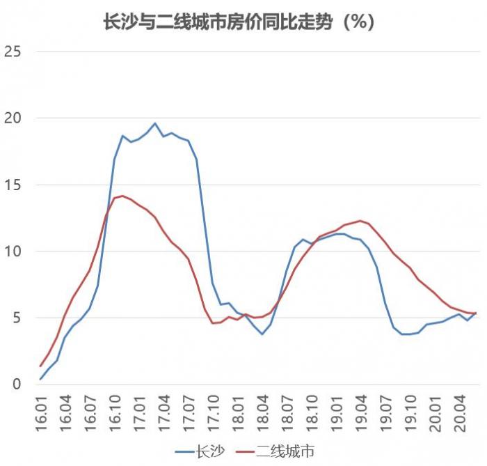 此后,长沙房价开始得到控制,从国家统计局发布的70城新房同比价格走势来看,2018年以后,大部分时间里,长沙新房同比涨幅开始低于70城中二线城市的平均走势。