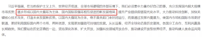 “一个以国内循环为主、国际国内互促的双循环发展的新格局正在形成。”