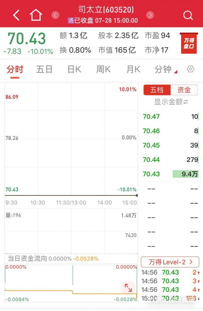 7月28日,司太立开盘即躺倒在跌停板上,截至收盘,报收70.43元/股。