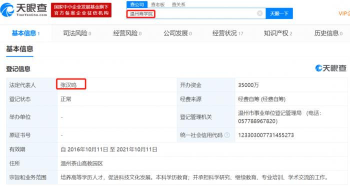 据天眼查信息显示,温州商学院的法定代表人为张汉鸣。