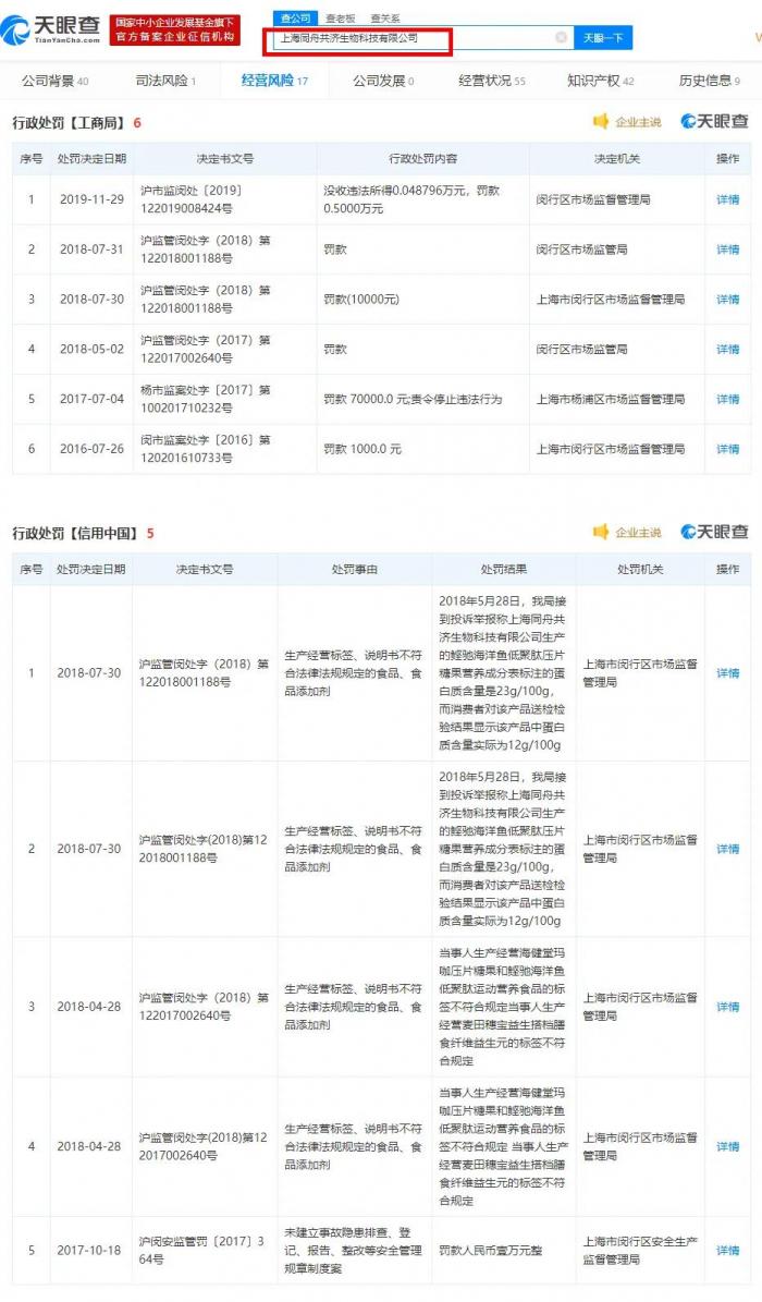 可天眼妹看了下发现,这个产品代加工厂曾因生产经营标签、说明书不符合法律法规规定的食品、食品添加剂等受到过多条行政处罚。