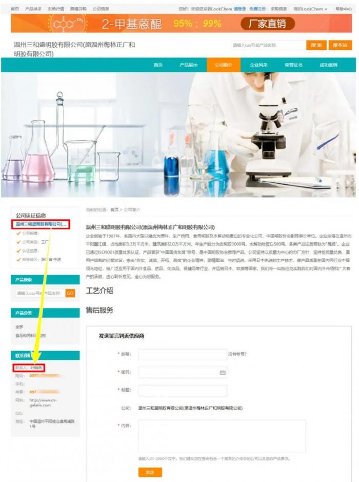 在有温州三和盛明胶有限公司认证的网站上,其联系人并非张汉鸣,而是一个叫做叶晓燕的人。