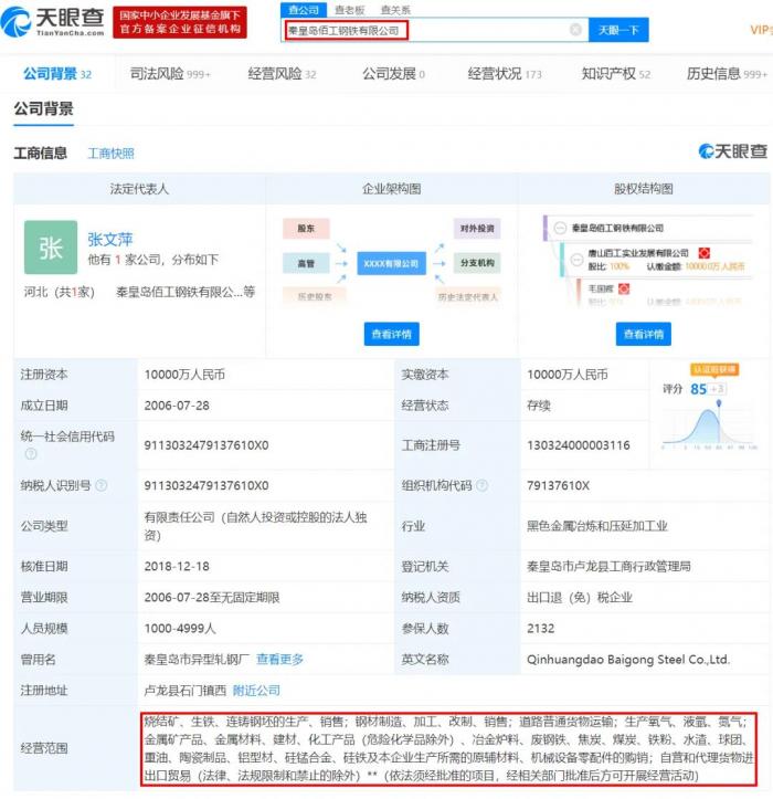 而后天眼妹发现该公寓的APP主体公司“秦皇岛佰工钢铁”,其经营范围为生铁、钢坯的生产等,与公寓经营毫无关系。