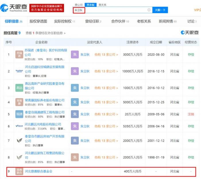 而且当时天眼妹在进行搜索时该APP store主页在5秒后竟然又变成了“秦皇岛高校后勤”,该公司的法定代表人朱立秋不仅是河北人大代表,同时还在河北慈善联合基金会中任职。