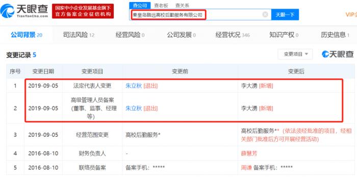 但值得一提的是,在“天价宿舍”事件曝光后不久,朱立秋就从秦皇岛鹏远高校后勤服务有限公司中退出了。