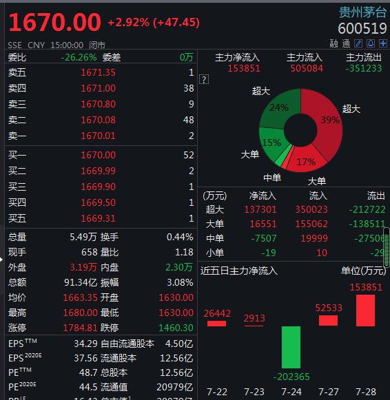 截至收盘,贵州茅台涨2.92%,报1670元,总市值为20978.5万亿,稳坐A股市值榜首。