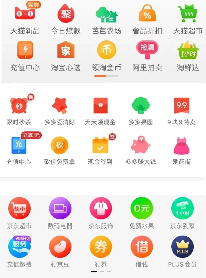 比如在淘宝APP上,“新品”、“聚划算”“天猫超市”正好对应了阿里新品新客、下沉市场、本地生活的战略方向。而京东,“超市”“到家”是优势业务,服饰则更需要流量扶持。在拼多多,“领现金”、“特卖”、“免费拿”则精准定位了它的目标人群。