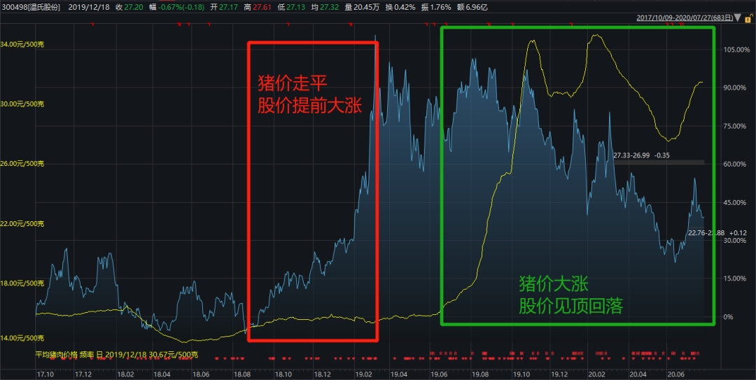答案就是在猪价还没大涨的时候,猪肉股就先行启动。等猪价真正涨起来,猪肉股价已经开始见顶回落。
