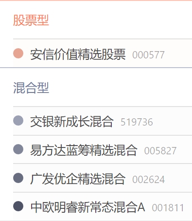 价值型主要是成熟的传统行业,例如食品饮料、家电、金融、地产等,组合中的安信价值精选、广发优企精选、易方达蓝筹精选都属于偏价值型;成长型则是仍在快速发展的新兴行业,例如生物医药、电子信息、传媒等等,组合中的交银新成长、中欧明睿新常态都是偏成长型。