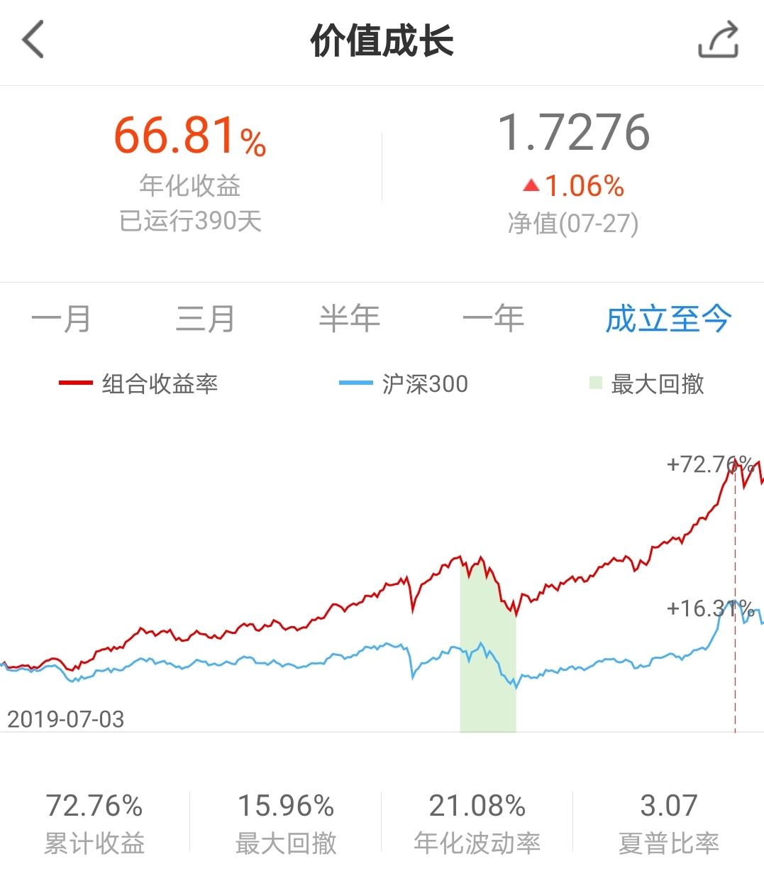 “价值成长”是我管理的激进型基金组合,定位是高风险高收益,目前累计收益率是72.76%,今年以来上涨36.5%,超越大盘27%左右。