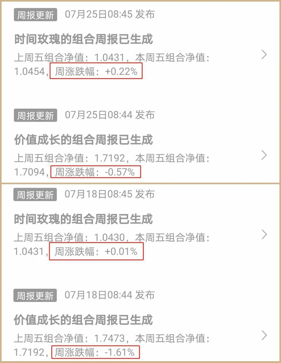那这两种模式的效果怎么样呢?在最近两周剧烈波动的股市里,大盘两次单日下跌4%左右,而偏股型组合“价值成长”的涨跌幅都控制在-2%以内,稳健型组合“时间玫瑰”两周都是正收益,都顶住行情波动。