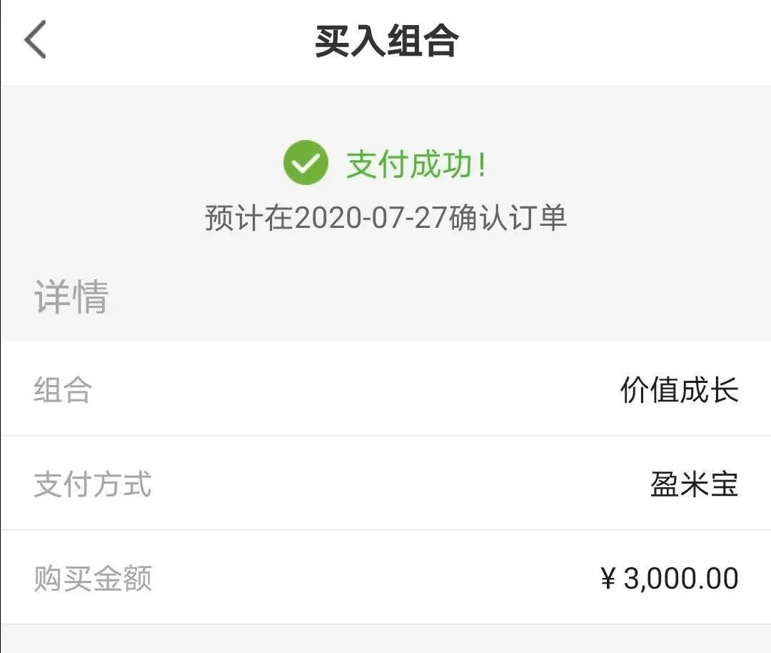 点买入之后会出现下面的界面。这里需要做两个步骤:第一步先选择充值盈米宝(类似于余额宝),充值完成后第二步记得继续选择买入组合。