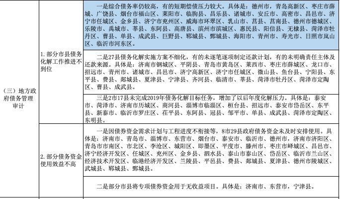 审计发现的主要问题:一是部分市县债务化解工作推进不到位。有的市县综合债务率仍较高,短期偿债压力较大;有的未完成2019年债务化解目标任务;有的市县债务化解实施方案未逐笔逐项制定还款计划,或未明确责任主体及还款来源。