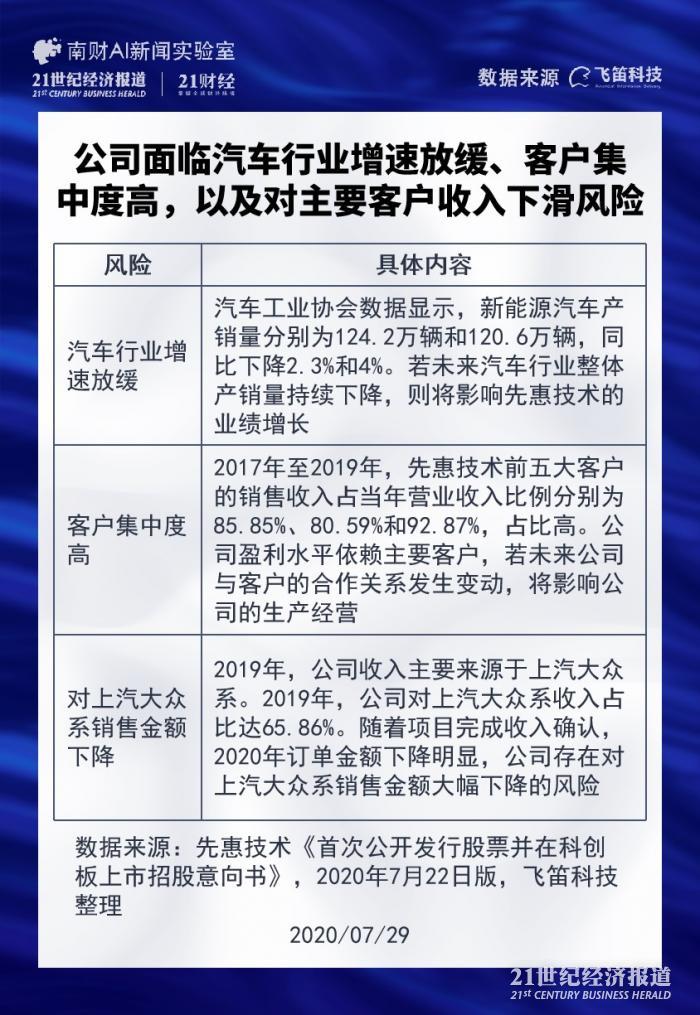 先惠技术于7月22日发布的招股说明书中提示了多个风险。经南财AI新闻实验室梳理,有三大风险跟公司经营高度相关,分别是汽车行业增速放缓、客户集中度高,以及对上汽大众系销售金额下降的风险。