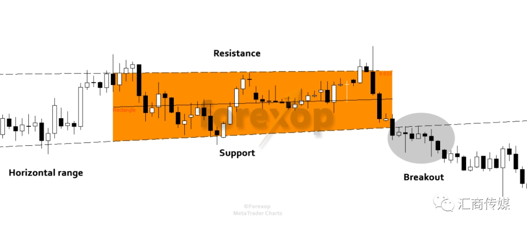 矩形区间的形式是区间的支撑位和阻力位几乎平行。矩形区间经常出现,频率略低于通道或者持续性区间。不管是只用眼睛寻找,还是使用指标识别,矩形区间其实都很容易发现,它有以下这些特点: