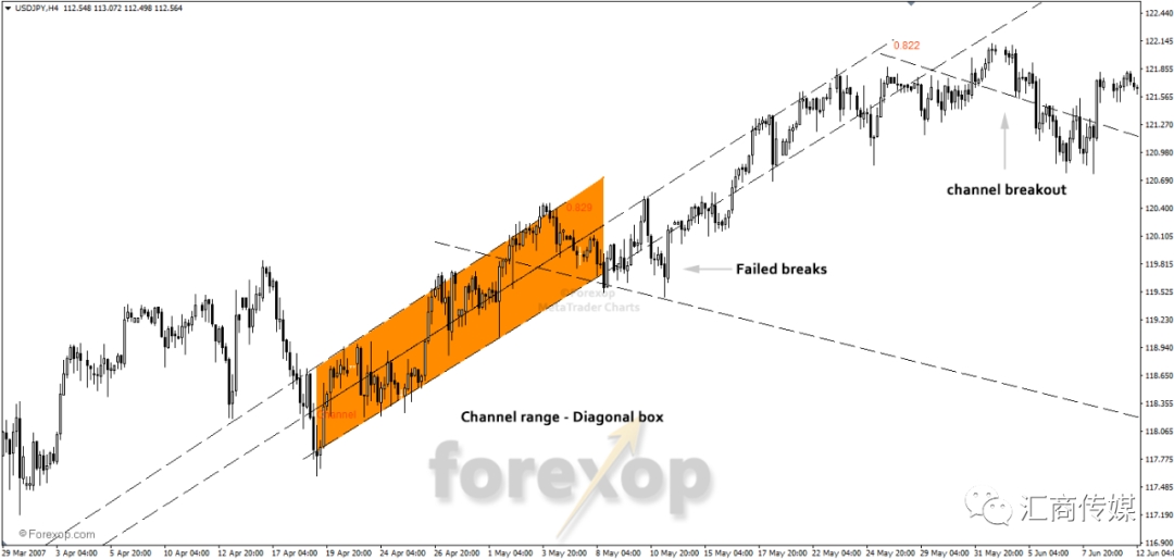 上图顺着区间的方向出现通道突破,这发生在美联储发布声明期间。价格向上突破300点左右后又回归了区间内。