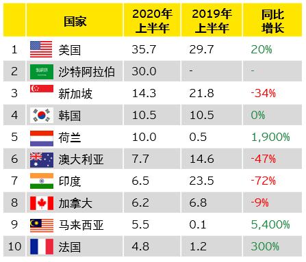 图表5:2020年上半年中企宣布的海外并购前十大目标国家(亿美元)