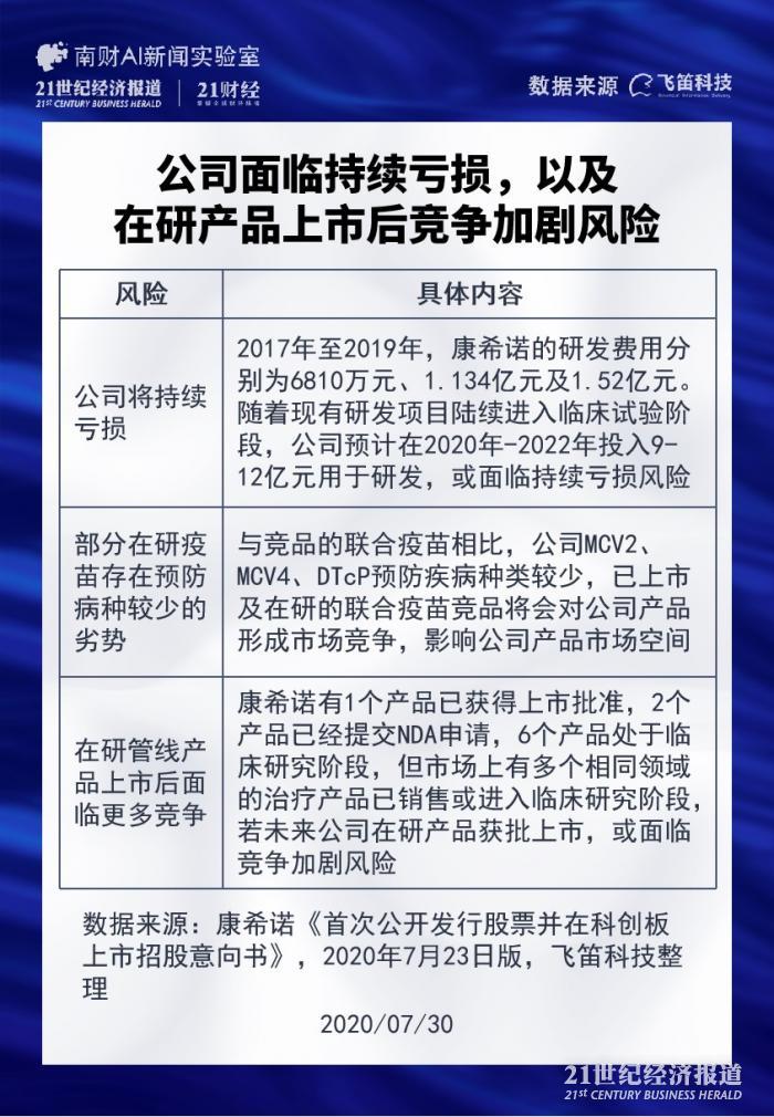 康希诺于7月23日发布的招股说明书中提示了多个风险点。经南财AI新闻实验室梳理,有三大风险点跟公司经营高度相关,分别是公司将持续亏损、部分在研疫苗存在预防病种较少的劣势,以及在研管线产品上市后面临更多竞争的风险。
