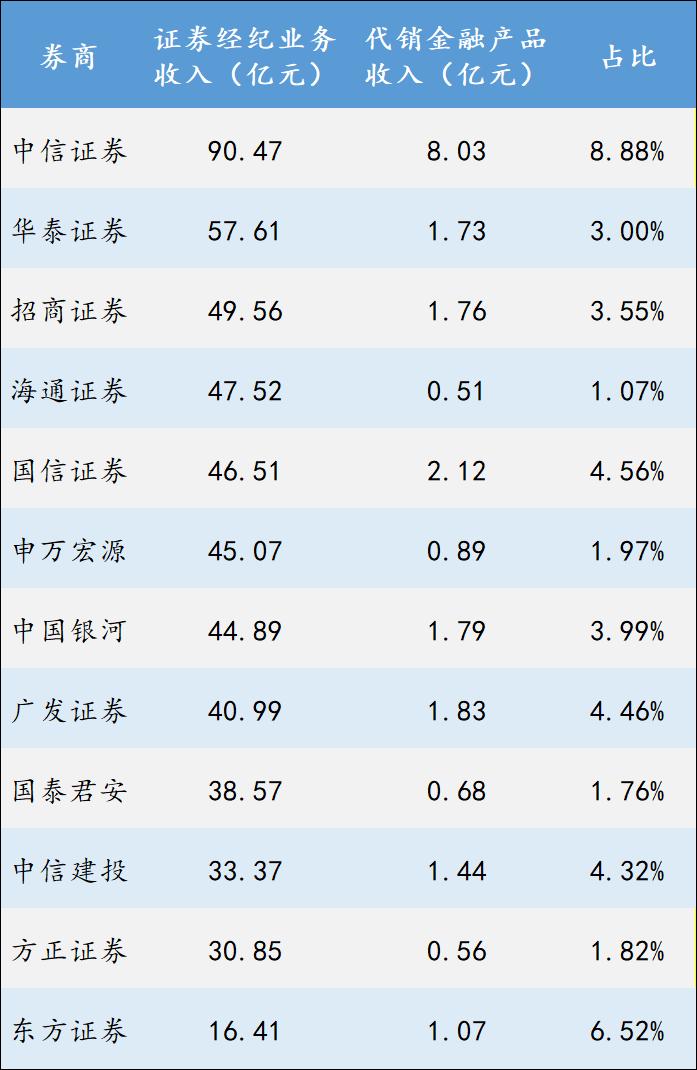 而国泰君安代销金融产品收入占证券经纪业务收入的比例为1.76%,在统计中的12家上市券商中处于相对末位。海通证券代销金融产品收入占比为1.07%,为统计中12家券商最低。