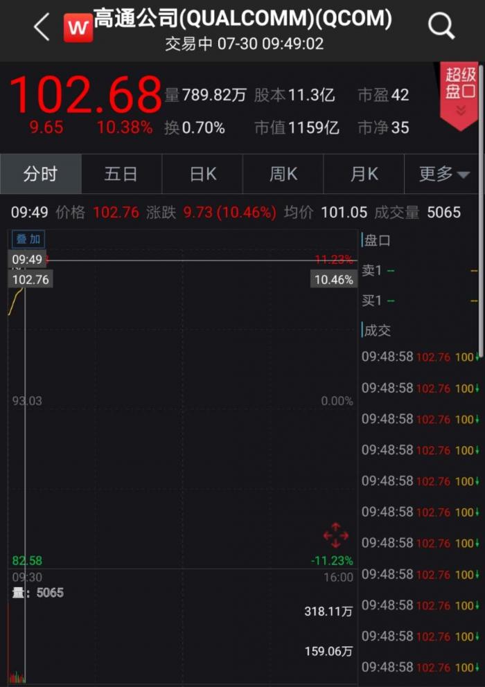 高通公司大涨10%,第三财季净利润大幅好于预期。数据显示,高通公司第三财季营收48.93亿美元,去年同期96亿美元;第三财季净利润8.45亿美元,市场预期4.86亿美元,去年同期21.49亿美元。