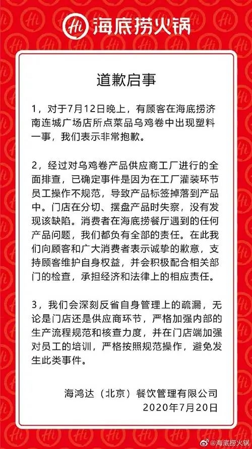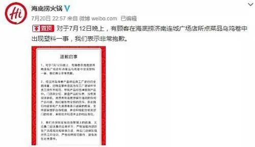 7月20日晚,@海底捞火锅发布微博称,对顾客消费时遇到的情况表示非常抱歉,有问题食品系供应商工厂灌装环节员工操作不规范,导致产品标签掉落到产品中。