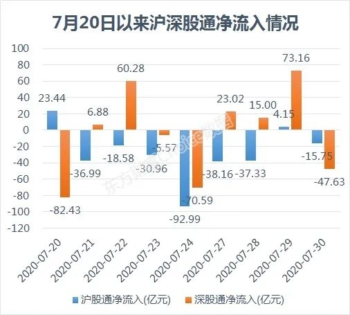 7月23日、7月29日和7月30日这三天虽方向相同,但“厚此薄彼”现象比较严重。尤其是7月29日,当天沪股通净流入4.15亿元,而深股通却净流入多达73.16亿元。