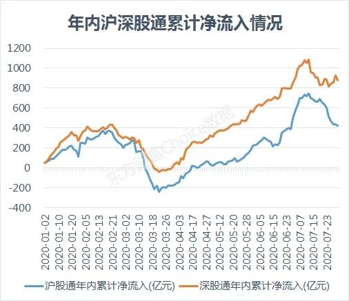 结果就是,年初至今,东方财富Choice数据显示,深股通累计净流入了881.77亿元,而沪股通只净流入了422.7亿元,7个月时间,深股通较沪股通多流入了一倍还多。