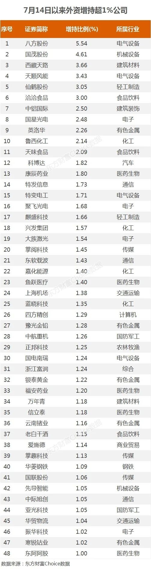 东方财富Choice数据显示,自市场7月14日开启回调以来,截至7月29日,陆股通共对48股增持(持股占流通股比增加)超1%,增持最多的三家公司是八方股份、国茂股份和西藏天路,增持比例分别是5.54%,4.61%和3.66%。