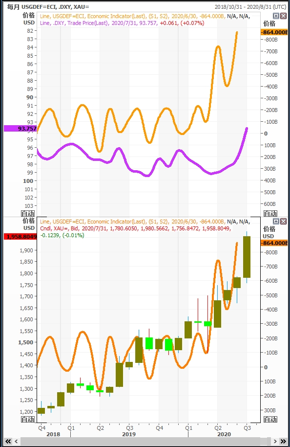 图4,上栏:Federal Budget Vs 美元指数(倒数); 下栏:Federal Budget Vs 黄金