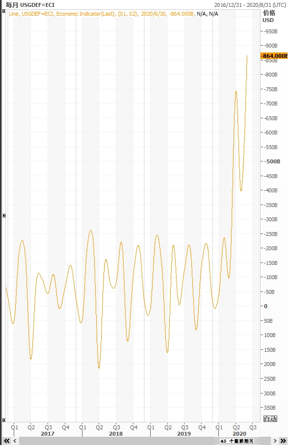 随着美国疫情的延续,美国财政部不得不继续拿出财政方案救助居民部门和企业部门。而财政赤字会继续上升,并且加速,如下图: