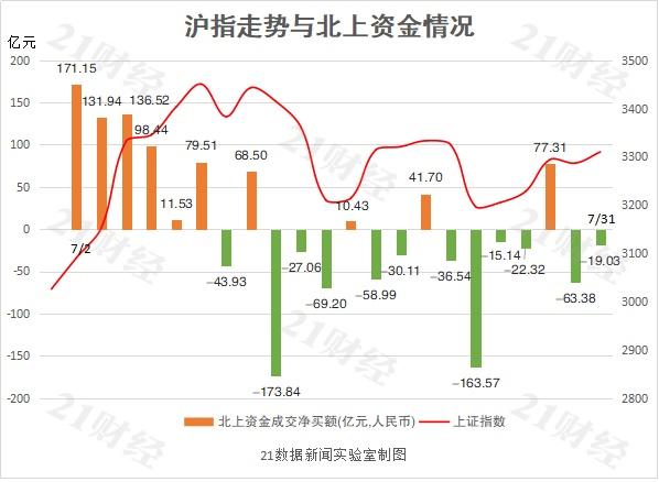 回顾7月份,北向资金先流入后流出,月初连续三日扫货逾百亿,但随后持续净流出,全月合计净买入103.93亿元,其中沪股通净买入7亿元,深股通净买入96.92亿元。