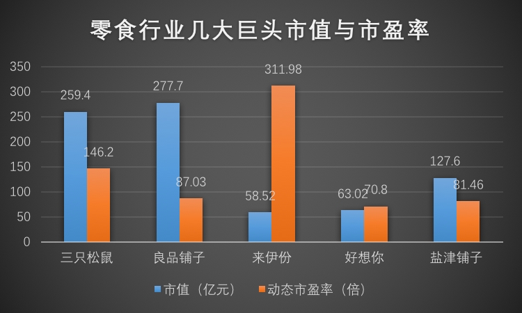 截至7月27日收盘,三只松鼠的总市值为259.4亿元,远高于休闲零食行业的来伊份、好想你、盐津铺子,仅略低于良品铺子。而三只松鼠的动态市盈率更是高达146.2倍,远高于良品铺子、好想你、盐津铺子,仅低于来伊份。