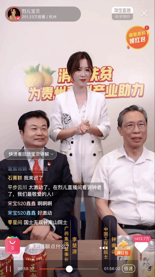 论坛还特别设置了别开生面的电商直播环节。钟南山院士、李楚源董事长、淘宝TOP主播烈儿宝贝组成“直播天团”,走进直播间,向网友介绍刺梨、刺柠吉等,科普维生素C对提高免疫力的作用,以幽默、轻松的语言与线上观众进行直播互动。直播累计超过258万人次观看,超过835万人次点赞。