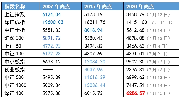 代表蓝筹风格的指数,比如沪深300、上证50、中证100,历史高点出现在2007年;