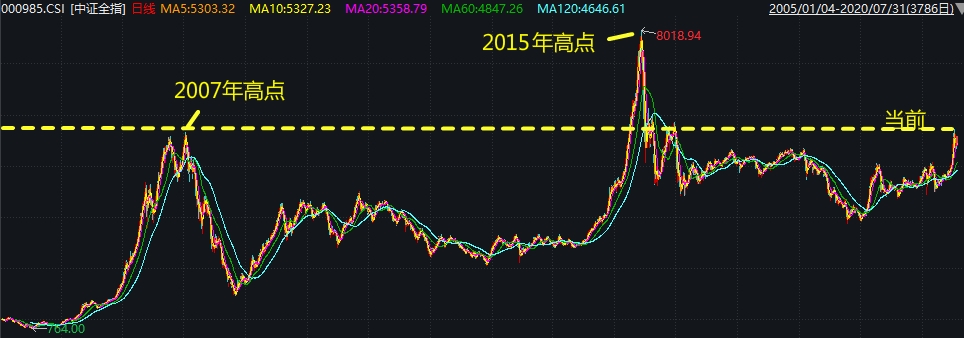 如果再看看代表市场整体的中证全指,你或许会对牛市有点感觉——它已经超越了2007年的高点,不过距离2015年的高点还有不小的距离。