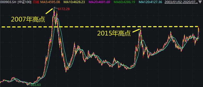 更有感觉的是大蓝筹代表中证100指数,它超越了2015年的高点,创下了2007年牛市以来的新高。