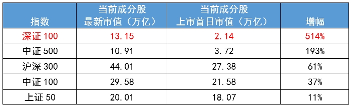 对比上证50、沪深300、中证100等指数,深证100最新市值较上市首日市值的增幅最大。
