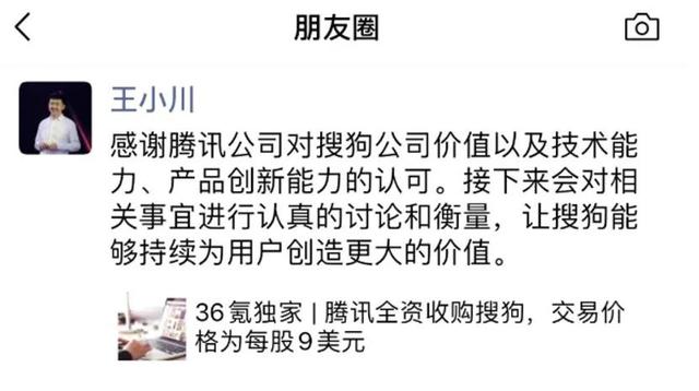 随后,搜狗CEO王小川在朋友圈发文,“感谢腾讯公司对搜狗公司价值以及技术能力、产品创新能力的认可。接下来会对相关事宜进行认真讨论和衡量,让搜狗能够持续为用户创造更大的价值。”
