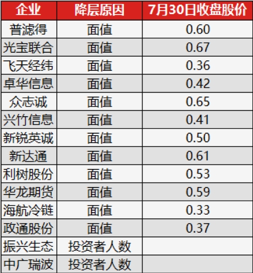 到7月30日收盘,正好为60个交易日。截至当日收盘,共有12家仙股因股价连续60个交易日低于面值,而从创新层降至基础层。