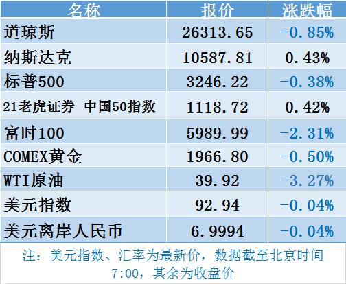 欧股集体大跌;受到核心经济数据不佳冲击,美股涨跌互现,道指跌0.85%,标普跌0.38%,纳指涨0.43%;Facebook、苹果、亚马逊、谷歌均交出超预期财报;首日上市的理想汽车收盘涨43.13%;21老虎证券-中国50指数收报1118.72点跌0.42%。50只成分个股中百位亚太、香港中华煤气、药明康德等17只个股上涨;美油跌3.27%。