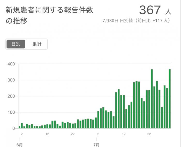 不仅仅是东京,近来日本各地都开始出现疫情加速反弹的现象,多地发生单日新增破纪录的情况。7月29日,大阪日新增221例确诊,创当地记录,截至7月31日,大阪累计确诊4057例;7月31日,冲绳日新增71例确诊,创当地记录。