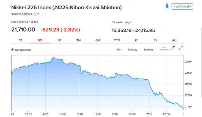7月31日,日本东京都知事小池百合子通报称,今日东京新增确诊新冠病例463例,为疫情暴发以来首次突破400关口。疫情加速蔓延之下,日经225指数收跌629点,跌幅近3%,为连续6个交易日下跌,创1年3个月以来最长下跌期。