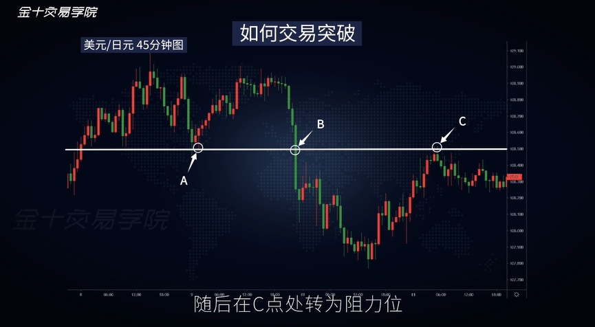 如下图中的美元/日元45分钟图,标注水平位在A点扮演支撑位,当它在B点被价格突破后,随后在C点处就变为阻力位。