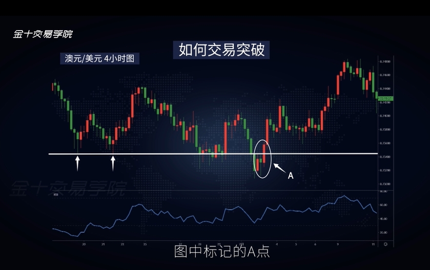 我们需要先确定支撑位,然后观察价格走低的势头有所减缓,像图中标记的A点一根K线完全处于支撑位下方,随后价格开始上涨,且第三个K线收盘价企稳在支撑位上方。