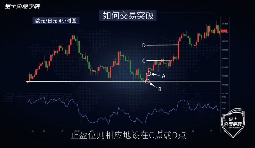 我们也用实际例子来演示,假设在下图A点入场,止损位应该在B点,或B点下方,止盈位则相应地设在C点或D点。